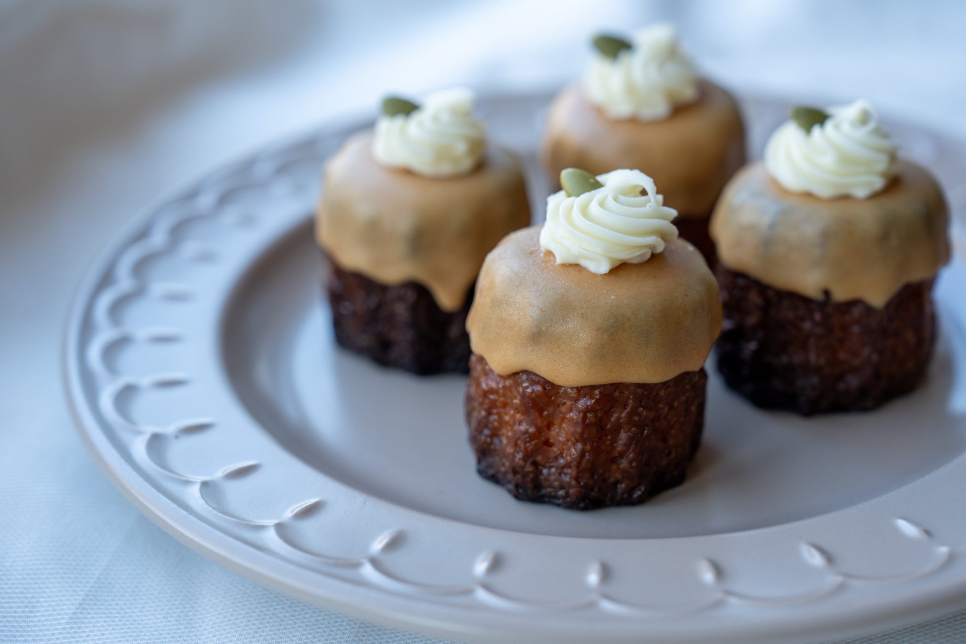 かぼちゃプリンカヌレはかぼちゃ風味のカヌレに、キャラメルチョコクリームをデコレーション。くちどけ滑らかな練乳入りのガナッシュと、かぼちゃの種をトッピングした、濃厚な味わいのカヌレです。