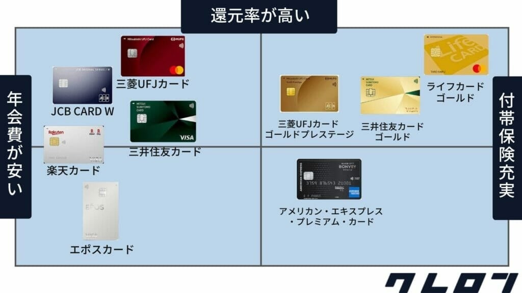 付帯保険充実→ライフカードゴールド、三井住友カードゴールド、アメリカン・エキスプレス・プレミアム・カード