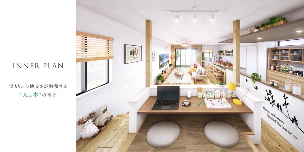 天井部分と壁面の白とのコントラストを描きながら木の風合いを漂わせるフロアやキッチン。そして、子どもがのびのび遊べる+αの続き間が温もりを感じる空間に仕上げています。
