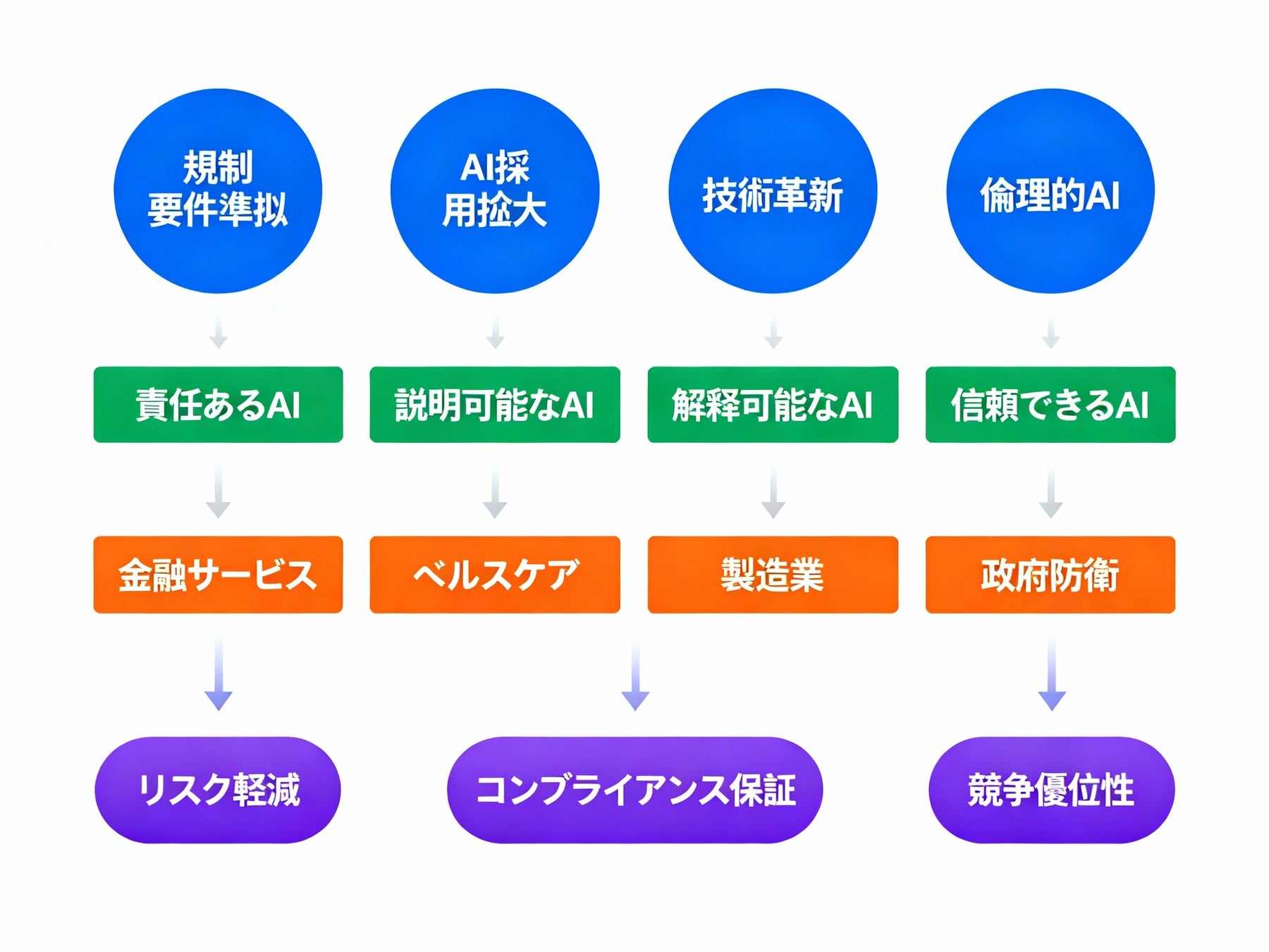 • 業界別実装戦略の展開:金融(不正検知、信用評価)、ヘルスケア(診断支援、患者予後予測)、製造(品質検査、予知保全)など、自社業界特有の責任あるAI実装パターンを確立