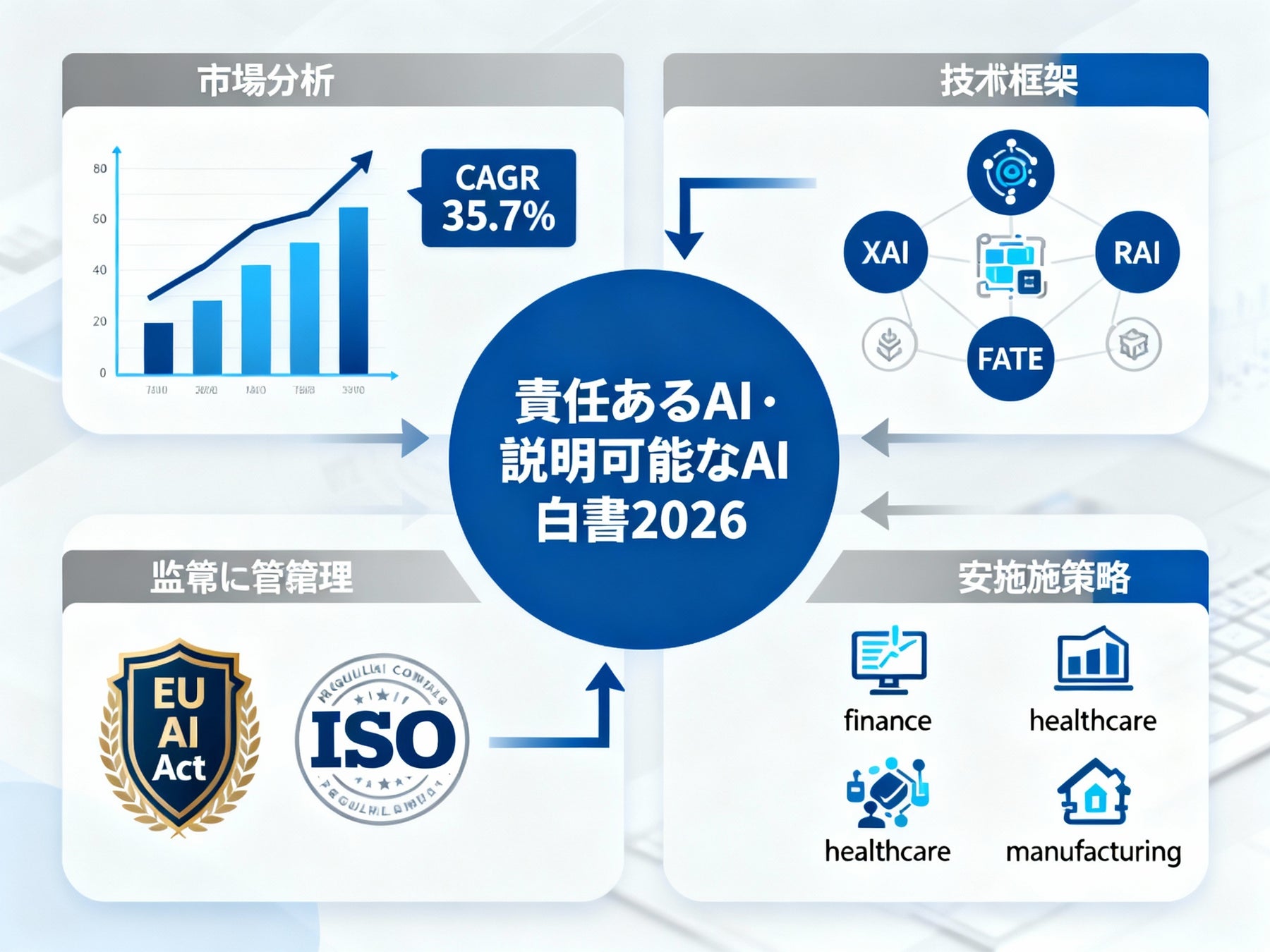 責任あるAI(RAI)、説明可能なAI(XAI)、解釈可能なAI、信頼できるAI(FATE)の統合的な理解が、AI技術の社会実装における競争優位の源泉となる。本白書は、2026年における最新の市場動向、技術体系、実装戦略、規制対応を包括的に分析し、AIガバナンス市場の爆発的成長(2024年2億2,760万ドルから2030年14億1,830万ドル、CAGR 35.7%)と、オブザーバビリティーを基盤とした実践的フレームワークを明示している。