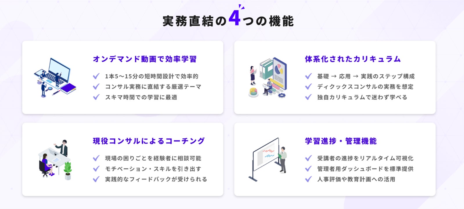 新卒・未経験層からマネージャークラスまで、短期集中型で“実務で使える”スキルの定着を実現します。