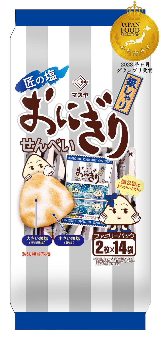 また、昨年発売10周年を迎えた「おにぎりせんべい 銀しゃり」は大きさの異なるつぶ塩がお米の旨味を引き立てる味わいでこちらも人気商品です。「おにぎりせんべい銀しゃりファミリーパック」は「第67回ジャパン・フード・セレクション(2023年9月)」において、最高評価であるグランプリを受賞しました!