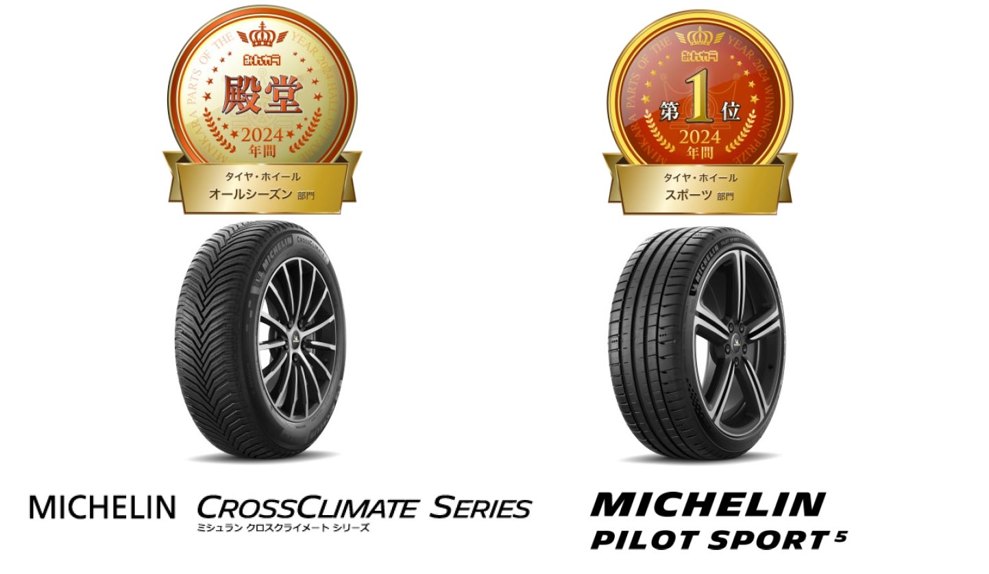 殿堂入りとなった製品は、昨年に引き続きタイヤ(オールシーズンタイヤ)部門の「MICHELIN CROSSCLIMATE(ミシュラン クロスクライメート)」シリーズとなります。また年間大賞1位にも、昨年に引き続きタイヤ(スポーツタイヤ)部門の「MICHELIN PILOT SPORT 5(ミシュラン パイロット スポーツ ファイブ)」が受賞しています。