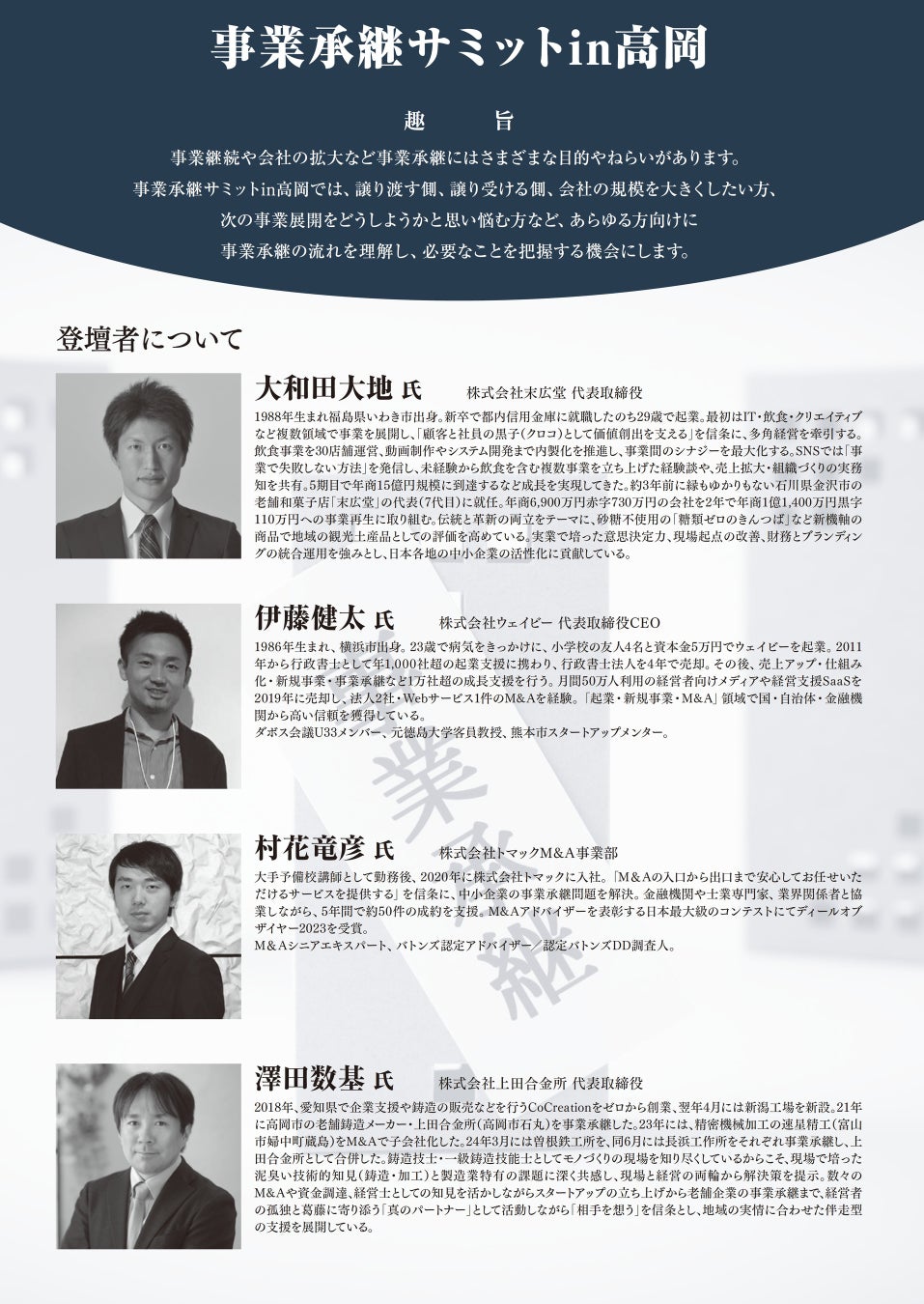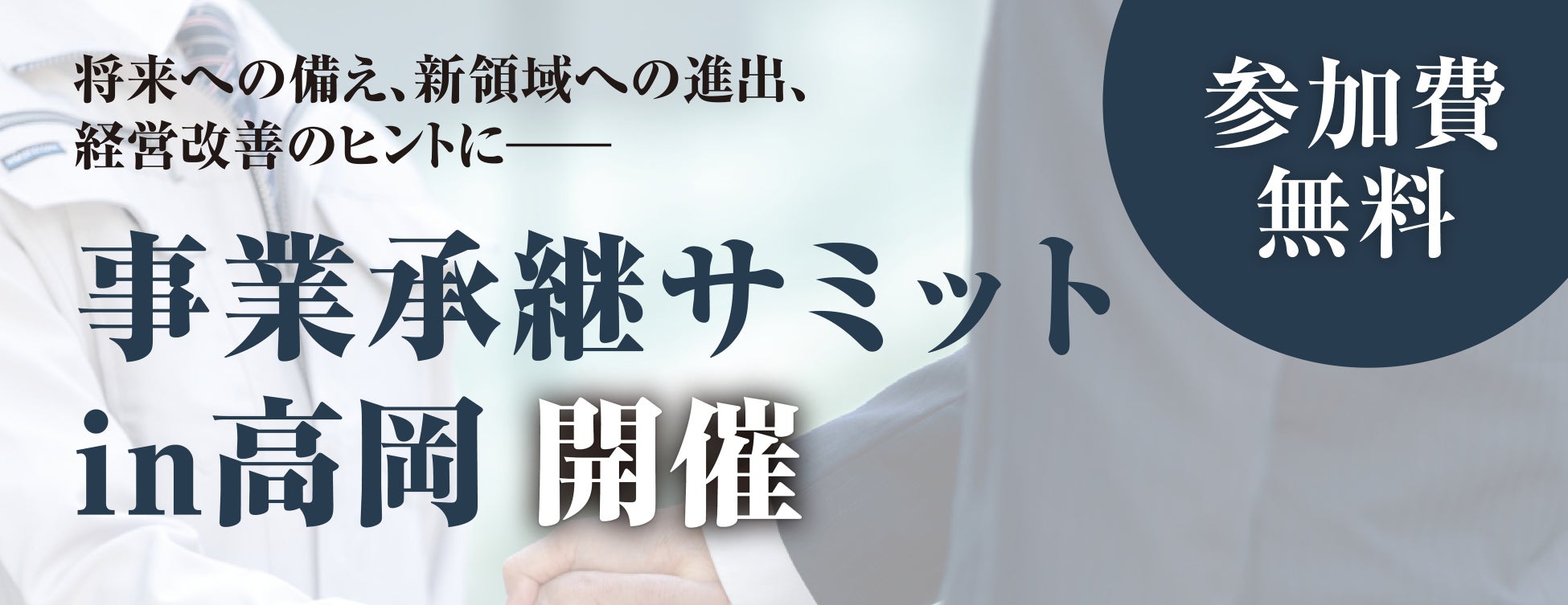 「事業承継サミットin高岡」(主催:高岡市、受託:北日本新聞社)が、1月22日午後2時から、同市御旅屋町の御旅屋セリオ4階にあるスタートアップ支援施設TASUで開催されます。