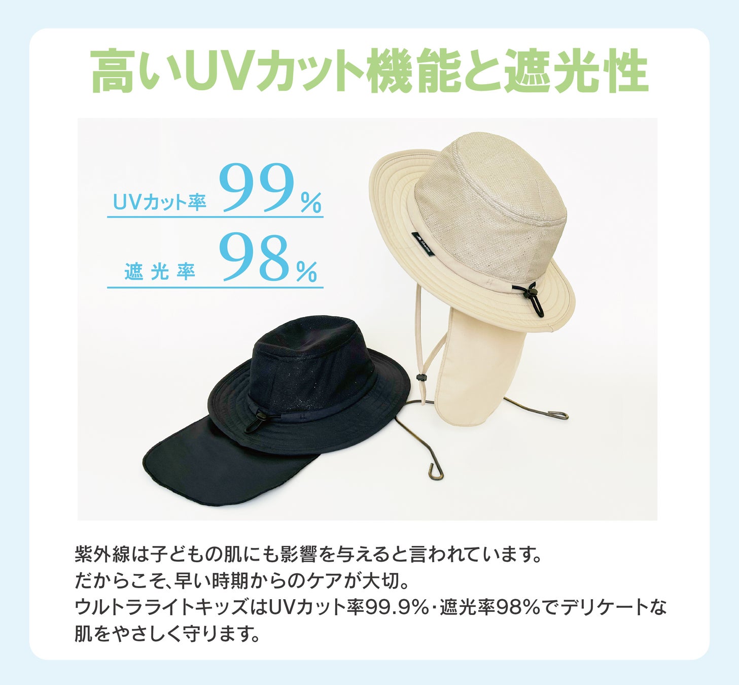 ウルトラライトハットKIDSは、UVカット率99.9%・遮光率98%の高い機能で、デリケートな肌をしっかり守ります。