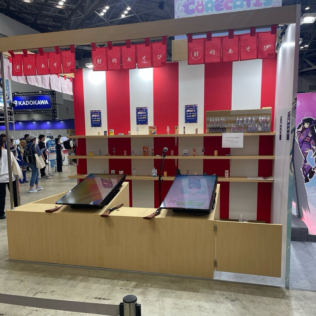 当社ブースには、無料で楽しめる射的ブースも設け、来場者の皆様に大いに楽しんでいただきました。射的に成功した方には、特製アクリルキーホルダーをプレゼントし、こちらも多くの来場者にご好評をいただきました。