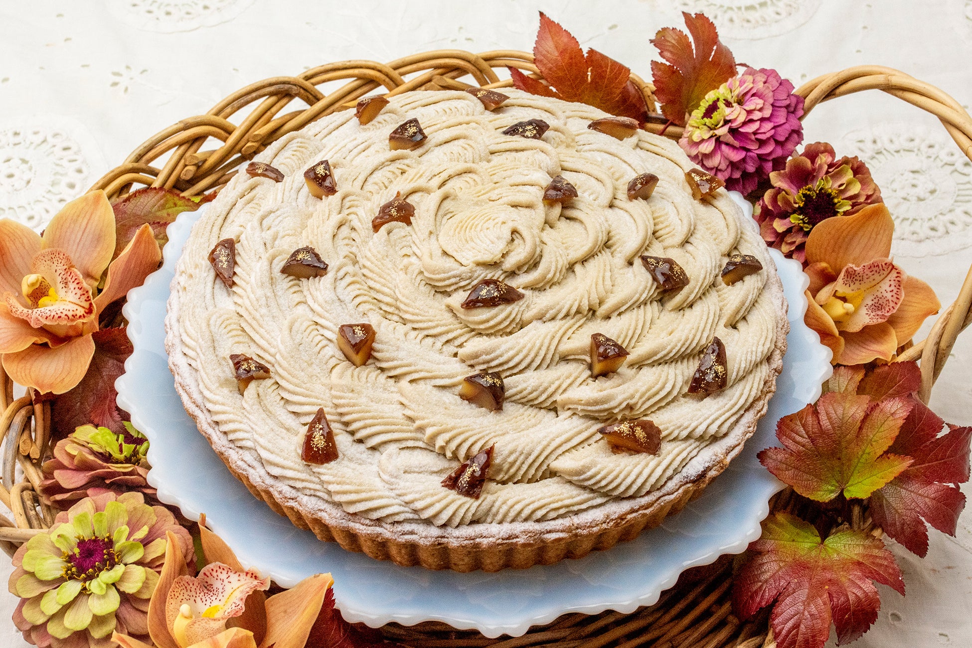 ミルク風味豊かなバターをたっぷり使用したパイ生地にホワイトチョコを加えたカスタードクリームを合わせ、パチンッとはじける果皮ごと楽しめるシャインマスカットと、雪のように真っ白なフリル状のクリームを飾りました。華やぐ季節にぴったりのタルトです。