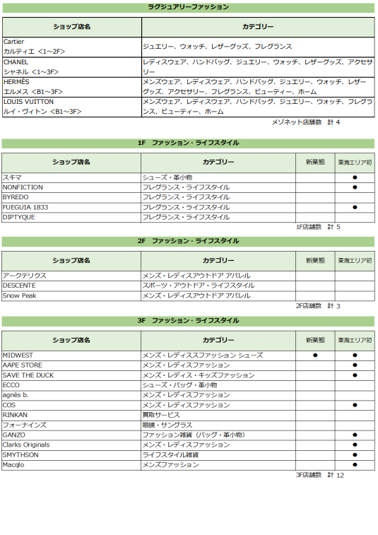 世界を代表するラグジュアリーブランドの旗艦店や、新たな文化を生み出すニュークラシックなファッションやライフスタイル提案の他、ハイグレードからカジュアルシーンまでを網羅したレストランやスイーツ等、東海エリア初上陸のショップも多数登場する全65ショップのラインナップとなります。