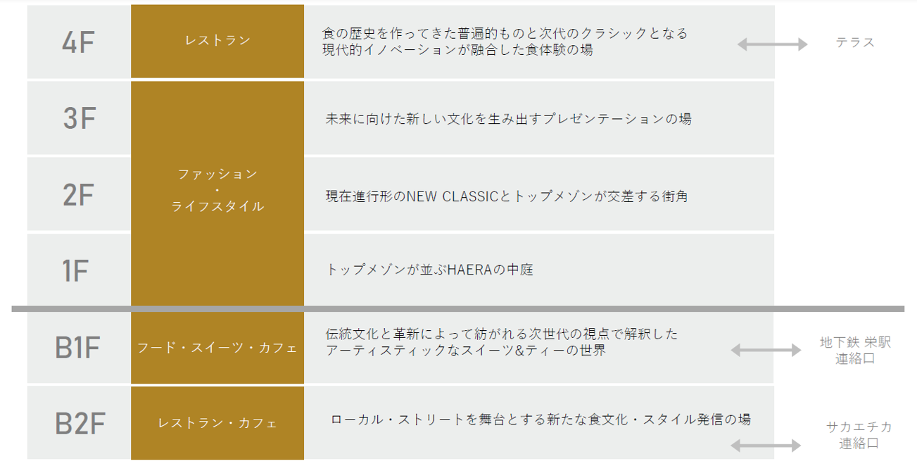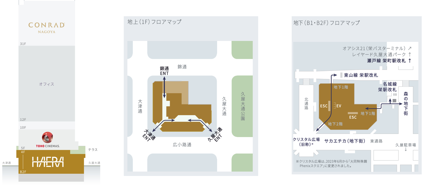 「ザ・ランドマーク名古屋栄」の地下2階~地上4階にてオープンするHAERA」は、久屋大通、広小路通、錦通、大津通の4つの大通りに囲まれ、地上の歩行者の回遊性ならびに地下ネットワークの向上に貢献します。B1Fは地下鉄栄駅の改札口に、B2Fは商業地下街に直結しています。徒歩、自動車、電車、バス全ての交通手段による全天候型のシームレスなアクセス動線を実現します。