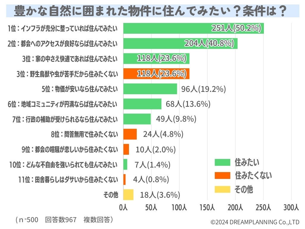 次に、豊かな自然に囲まれた物件で、どのような条件だったら住みたいか、住みたくない方には、なぜ住みたくないか聞いてみました。