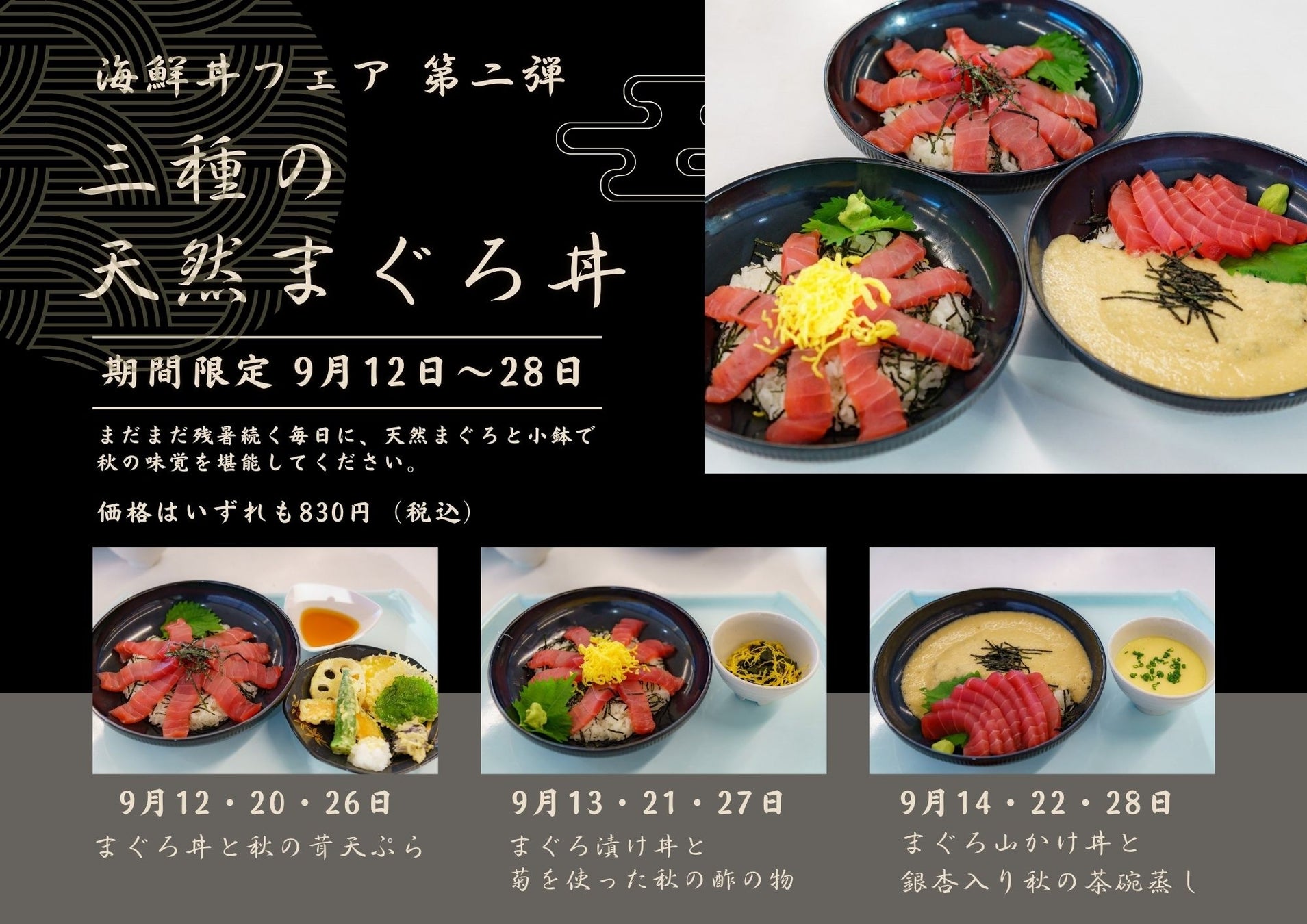 フェアは日替わりで「まぐろ丼と秋の茸天ぷら」「まぐろ漬け丼と菊を使った秋の酢の物」「まぐろ山かけ丼と銀杏入り秋の茶碗蒸し」の3種類(いずれも税込830円)をご用意しました。9月とはいえ、まだまだ残暑厳しい毎日に、TV、雑誌で「和食の達人」として紹介された食堂のチーフが「鮮魚と秋の味覚で活力を養ってほしい」と、天然のメバチマグロを独自ルートで買い付け、提供します。小鉢には秋の食材・茸、菊、銀杏を使用し、素材の味を最大限引き出せるメニューとなっています。