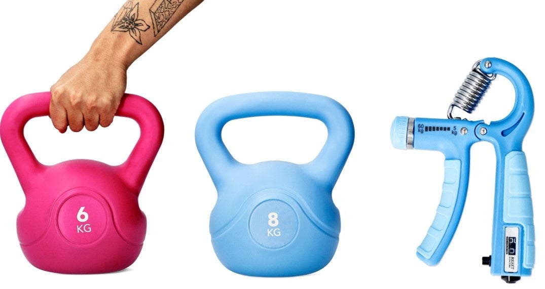 ショッキングピンクとパステルブルーでテンションアップ!6kgと8kgの本格ケトルベル。あたりまえに重いです!握力を鍛えられるハンドグリップもガチだけどカワイイ