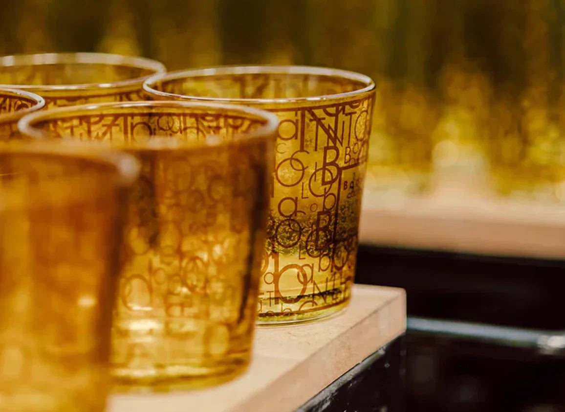 高温で溶かしたガラスを棒に巻き取り、職人が息を吹き込んで形を作る伝統技法です。
