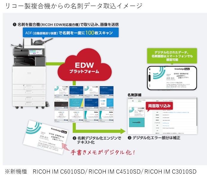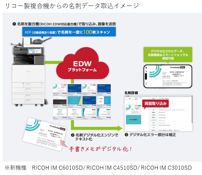 本機能により、名刺サイズに対応したADF(自動原稿送り装置)を搭載したリコー新機種複合機において、名刺の表面・裏面を一度に最大100枚までスキャンし、『Knowledge Suite(ナレッジスイート)』へ一括で取り込みできるようになりました。名刺に記載されている手書きのメモも取り込むことが可能です。