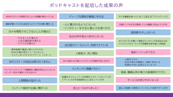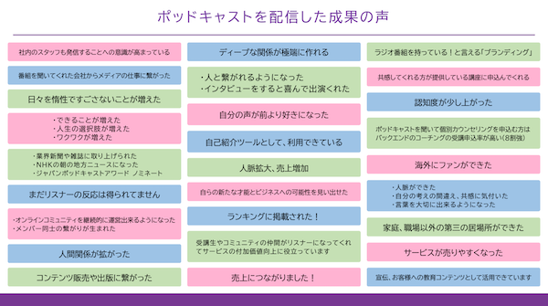 ◾️「ランキングに掲載された!」「海外にファンができた」など、ポッドキャスト配信をきっかけにビジネスの成果が生まれることも