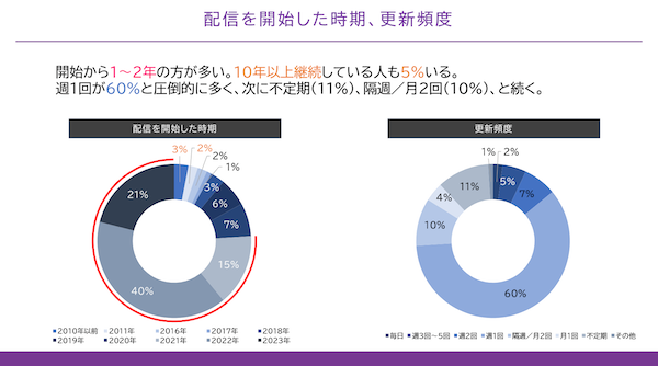 2021年以降に配信を開始した配信者が圧倒的に多いものの、10年以上配信を継続している配信者も5%も存在する。また、配信頻度は60%が週1回更新しており、次いで不定期、隔週と続く。