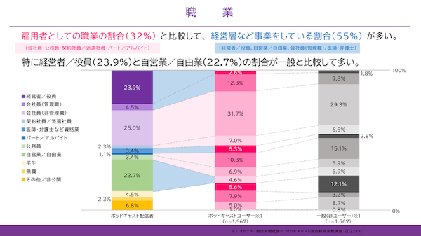 ポッドキャストの配信者は、経営層など事業をしている割合が高く、経営者が23.9%とポッドキャストユーザーや非ユーザーに比べ多い傾向にある。