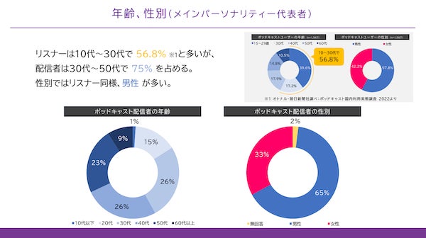 ◾️配信者は30代~50代が75%、リスナーよりも年齢層が高め。男性配信者が過半数を上回る。