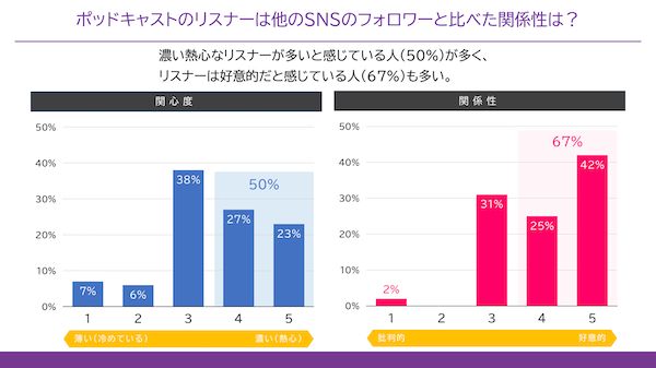 ◾️ポッドキャストの配信者とリスナーは、他のSNSのフォロワー特レベ熱心で好意的な関係性
