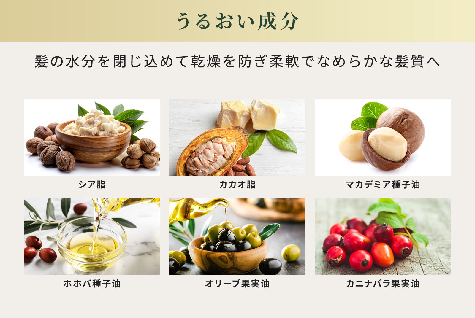 天然由来成分90%以上!うるおい成分が髪の水分を閉じ込めて乾燥を防ぎ、柔軟でなめらかな髪質へ導きます。また、カカオバター※1とシアバター※2が髪の毛を保護し艶やかな髪に仕上げます。※1カカオ脂※2シア脂