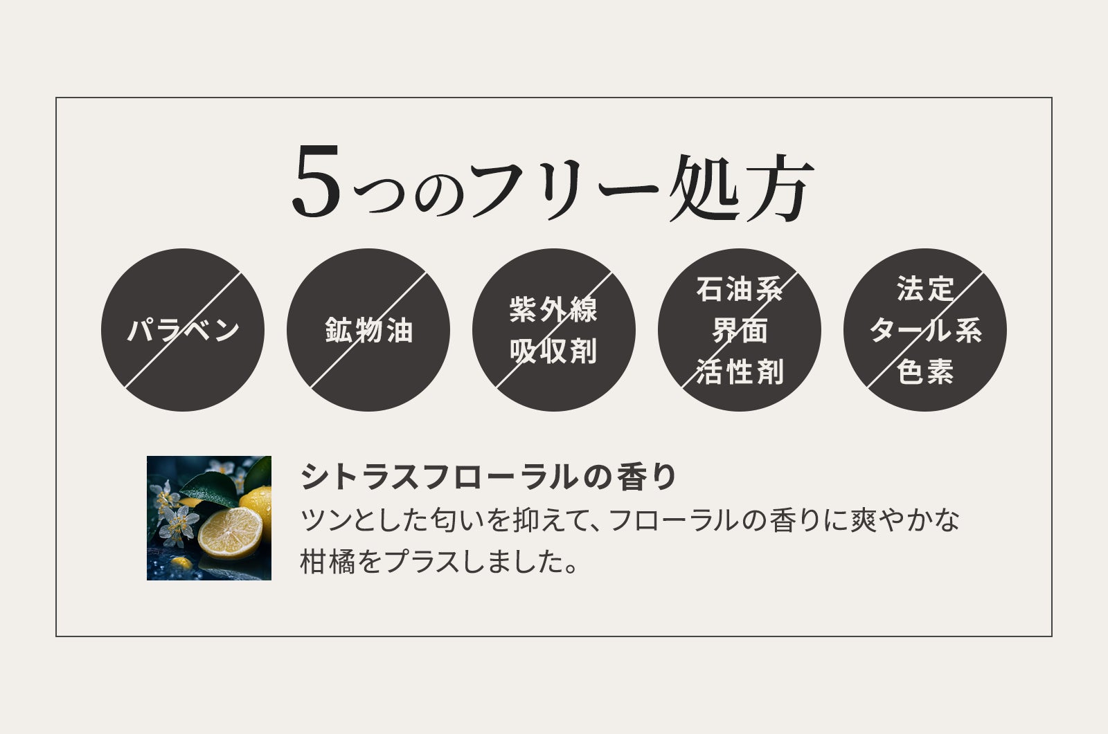 肌に優しい5つのフリー処方(パラベン、鉱物油、紫外線吸収剤、石油系界面活性剤、法定タール系色素)で、肌が敏感な方にもおすすめです。
