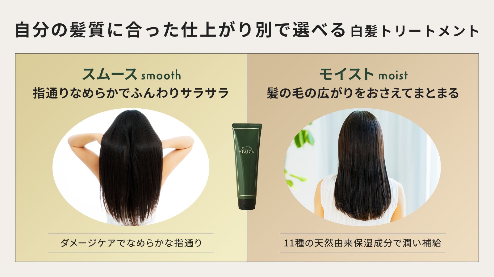 当社は女性の髪や頭皮のお悩みに寄り添って様々な情報を提供しているWEBサイトを運営しています。その中で、白髪のお悩みについての声が商品開発のきっかけとなりました。白髪は、人生の中で長く付き合っていく悩みのうちの1つです。HEALCA(ヘルカ)白髪カラートリートメントは、毎日のケアが簡単で心地よく続けられるように、こだわり抜いた成分で作り上げています。