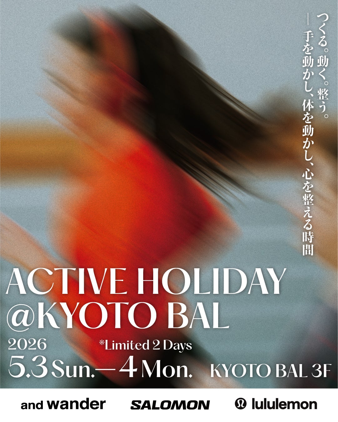 このたび、京都BAL(所在地:京都市中京区/運営会社:株式会社中澤ホールディングス/代表取締役社長:中澤 勇)は、and wander、SALOMON、lululemonの3ブランドによるイベント「ACTIVE HOLIDAY @ KYOTO BAL」を、2026年5月3日(日)・4日(月)の2日間限定で開催いたします。