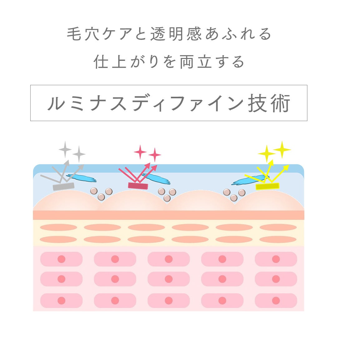 厚塗りや白浮きを防ぎながらくすみや色ムラをカバーし、素肌にも負担をかけにくいカバー技術。厳選したカバー素材がそれを叶えます。下地とファンデーションには毛穴に負担をかけず透明感を引き出す「ルミナスディファイン技術」、コンシーラーには光で凹凸までカバーする「ルミナスヴェール技術」、フェイスパウダーには明るく艶やかな仕上がりを叶える「ルミナスフォーカス技術」を搭載しました。