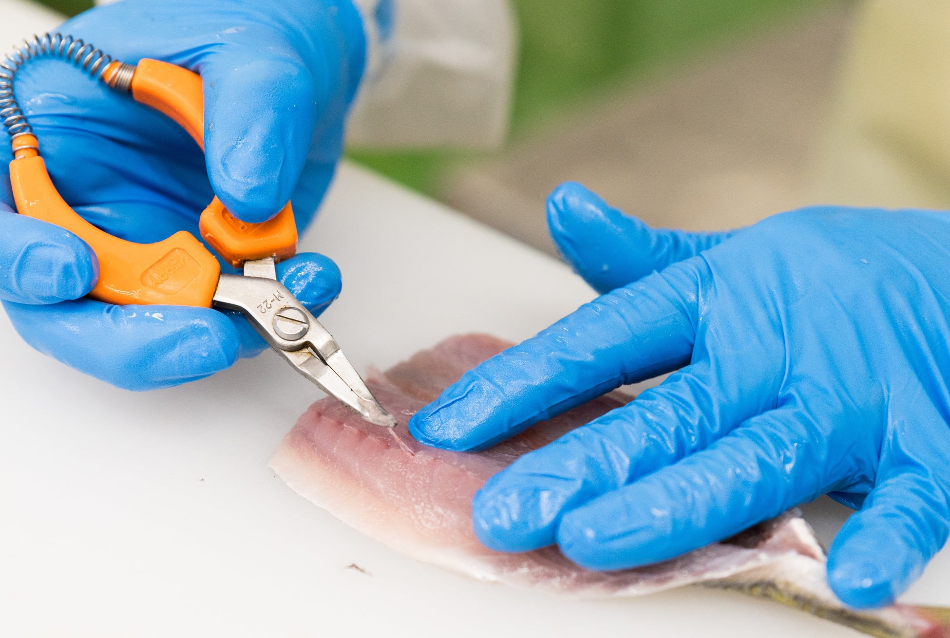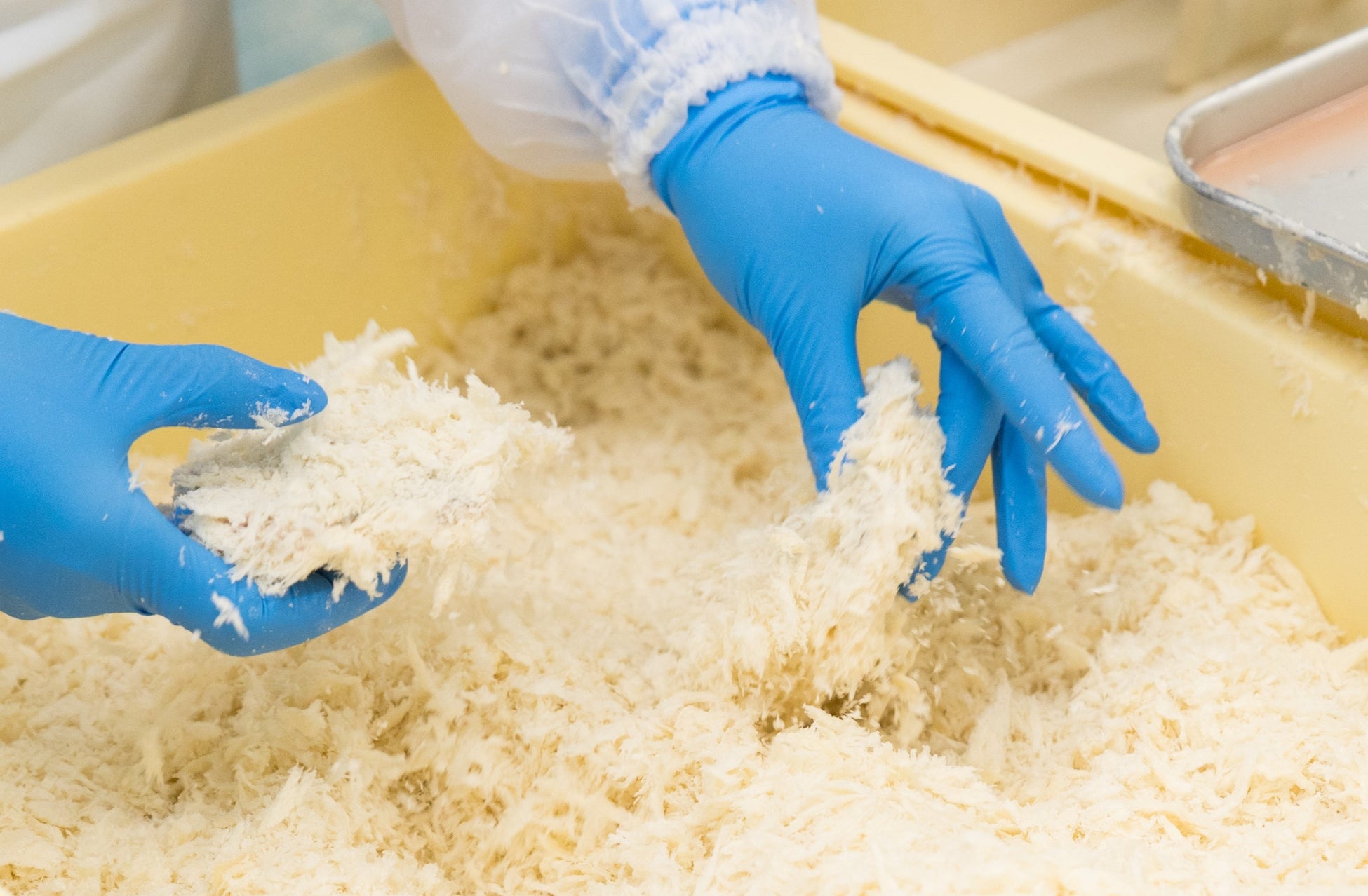 背びれをハサミでカット、頭と内臓を取り除いた後、骨やウロコが残っていないか、人の手で1匹ずつ確認。衣付けも手作業で行い、ふっくらした生パン粉をふんわりとやさしく付けていきます。
