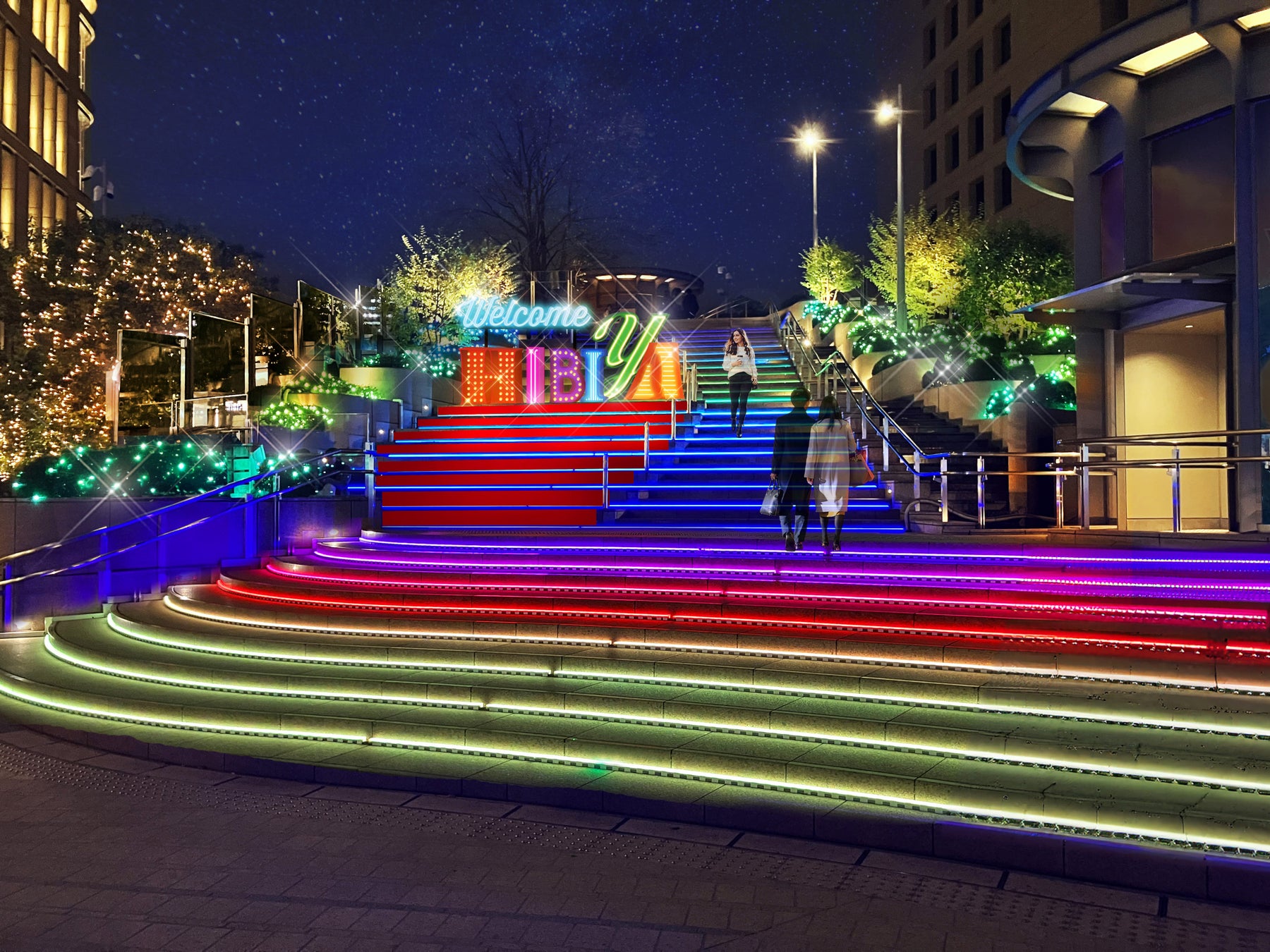 【東京ミッドタウン日比谷】クリスマス後も東京ミッドタウン日比谷では引き続きイルミネーションが楽しめる! 大階段が虹色に輝く新たなフォトスポット「HIBIYA WELCOME ROAD」も登場