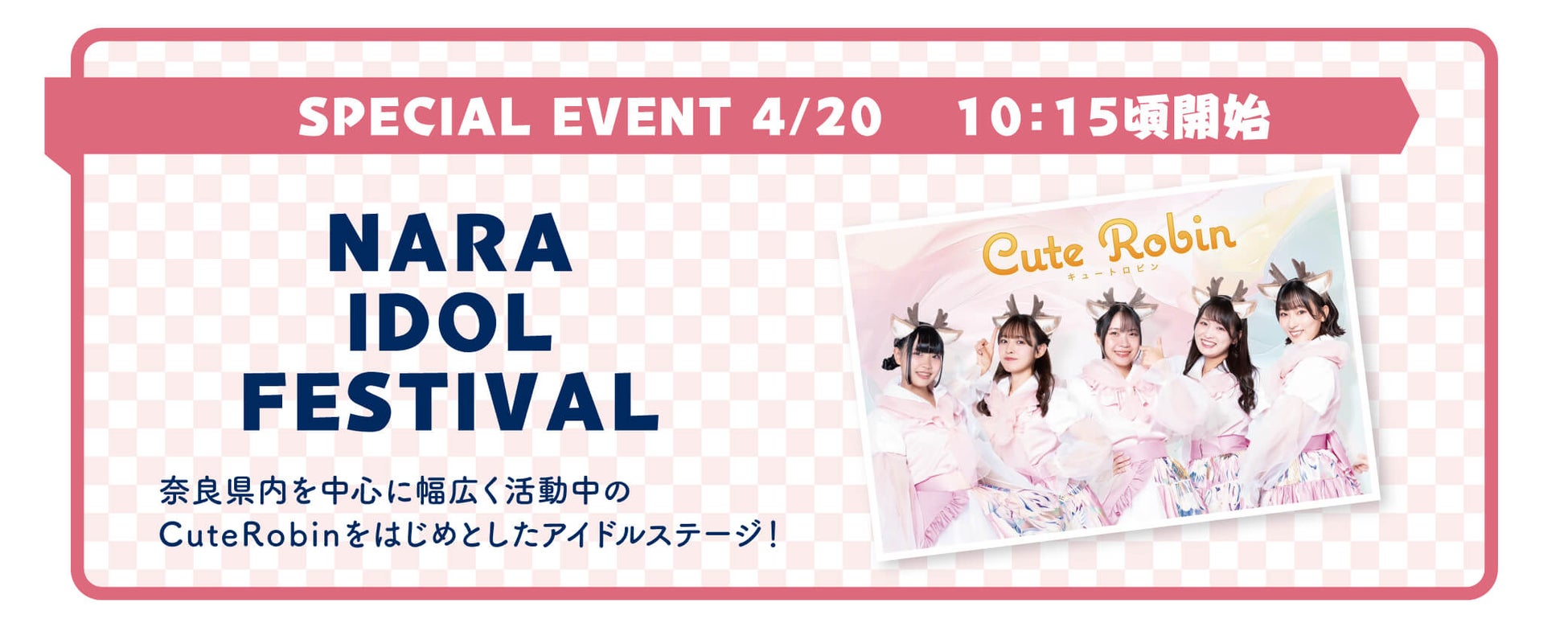 またスペシャルイベントとして、お笑い芸人のサバンナ八木さん、はるかぜに告ぐの2組によるお笑いステージと、奈良県内を中心に活動中のCuteRobinをはじめとしたアイドルFesで会場を盛り上げます。