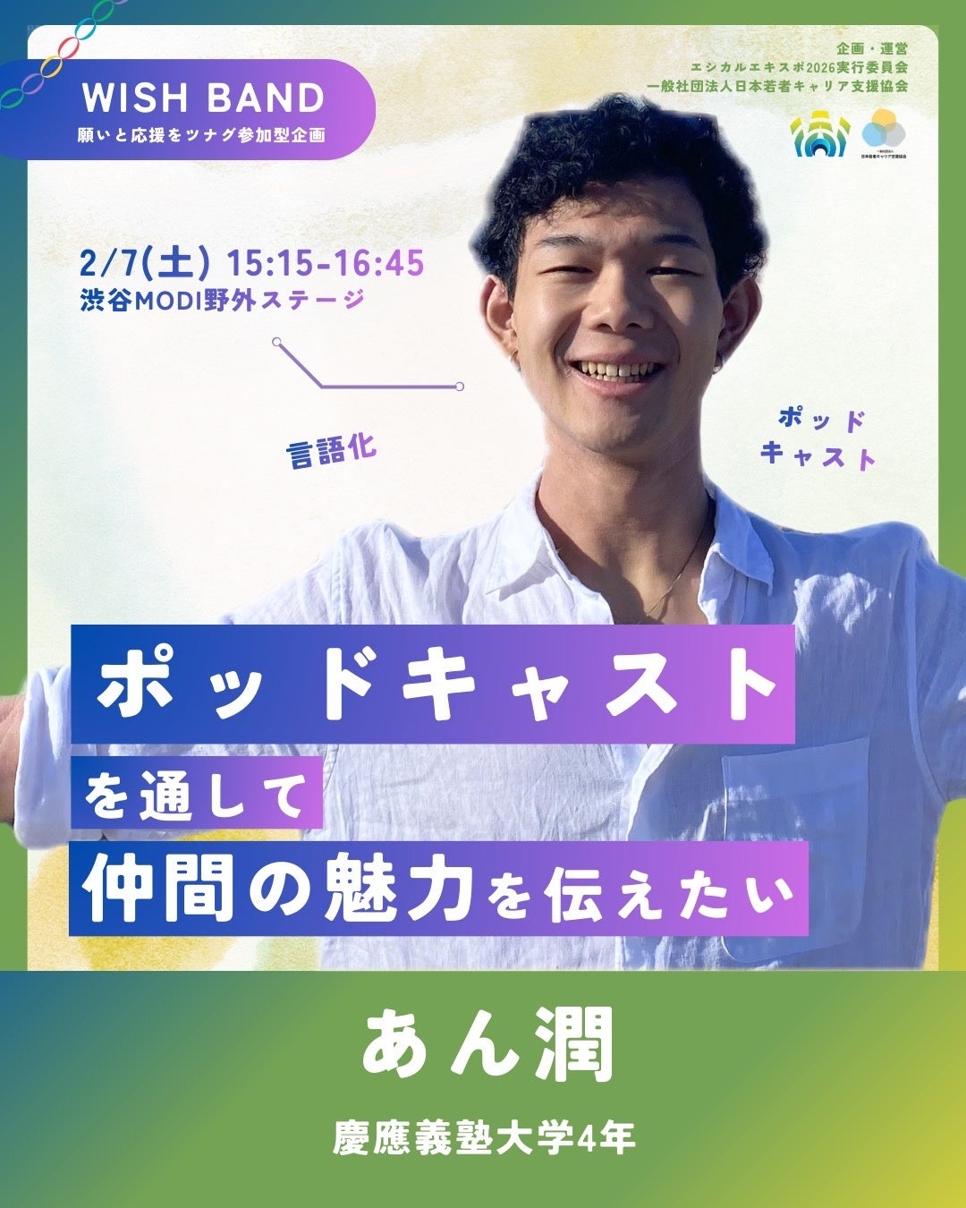 一般社団法人ETHICAL EXPO JAPANと一般社団法人日本若者キャリア支援協会(以下、JYC)は、2026年2月7日(土)~8日(日)、渋谷モディ 1階野外ステージにて、若者の願いや社会に対する想いを繋ぐ『WISH BAND(ウィッシュバンド)』を開催します。