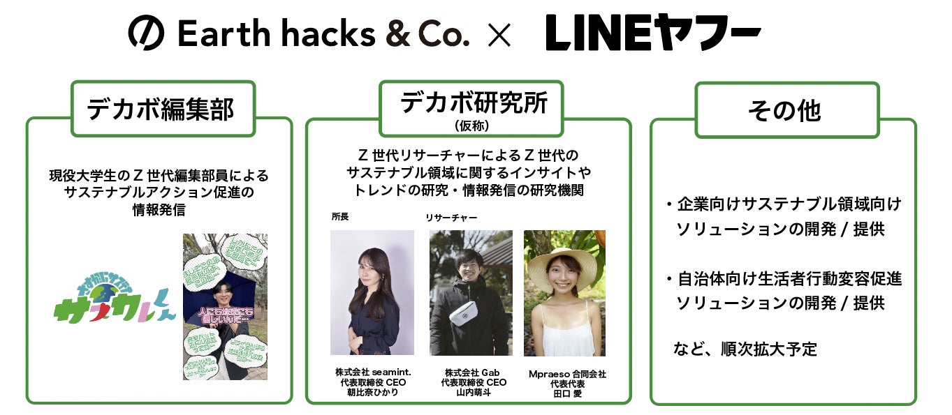 Z世代生活者のサステナブルに関するインサイト、行動、トレンドの研究機関「デカボ研究所(仮称)」をEarth hacksとLINEヤフーと共同設立し研究及び情報発信をしてまいります。Z世代を代表する専門家、起業家などのリアルなZ世代の動向を把握する多様なリサーチャーをテーマ毎に迎え、LINEヤフーの持つ「LINEリサーチ」を活用し定性・定量の観点より研究活動を展開します。研究結果についてはメディア及び企業に提供するサービス順次開始してまいります。