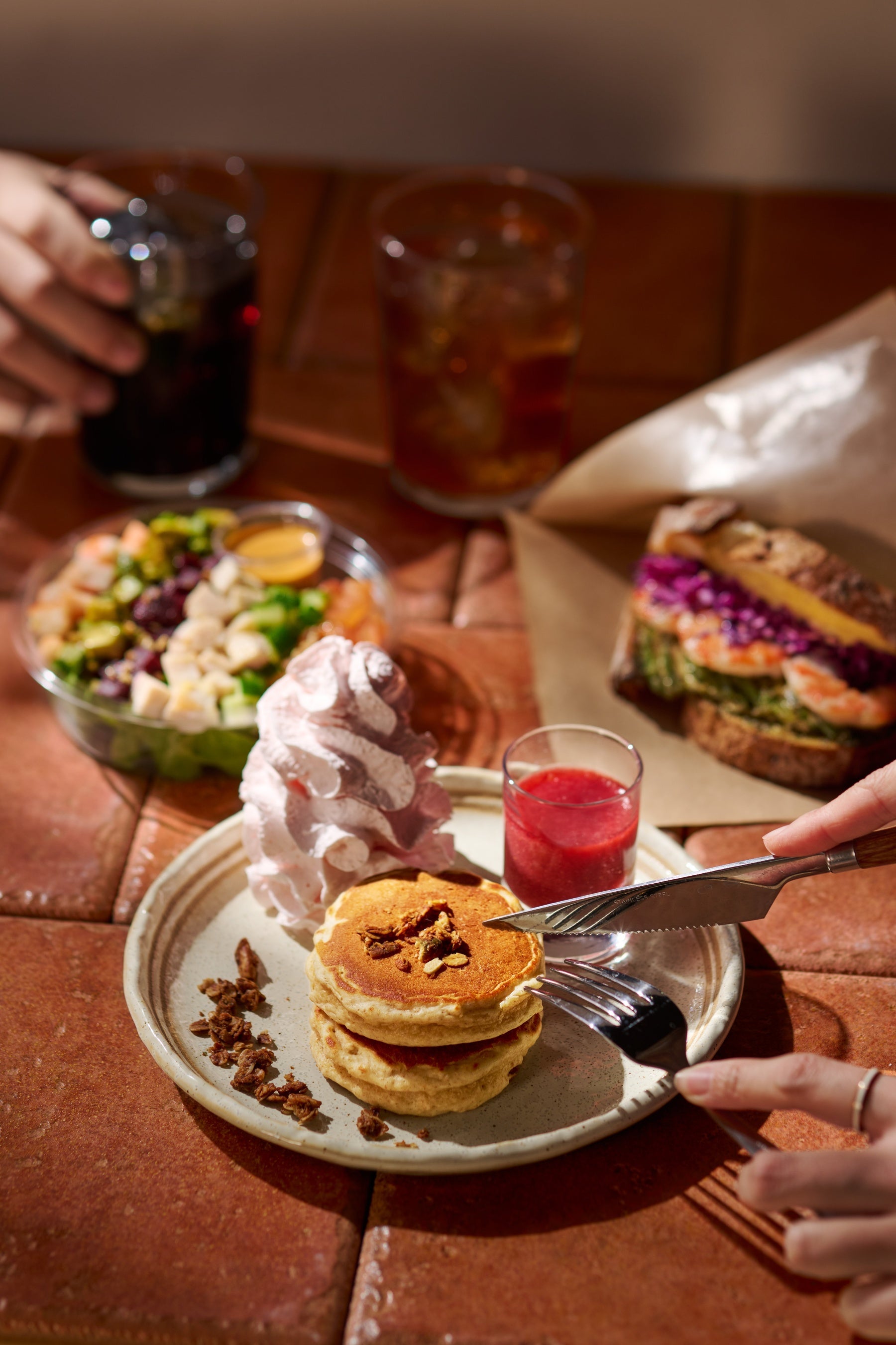 店内には、パンケーキが焼き上がる様子を目の前で楽しむことができる、ライブ感たっぷりの「パンケーキバー」を用意。香ばしい香りとともに、焼きたてならではの臨場感をお楽しみいただけます。パンケーキは一枚からご注文可能。素材の味をシンプルに堪能するのはもちろん、目の前でバーナーを使って仕上げるトリュフバターのトッピングや、ご注文ごとにブレンダーでつくるフレッシュなフルーツソースとの組み合わせもおすすめです。その日の気分やシーンに合わせて、思い思いの焼きたてパンケーキをお楽しみください。
