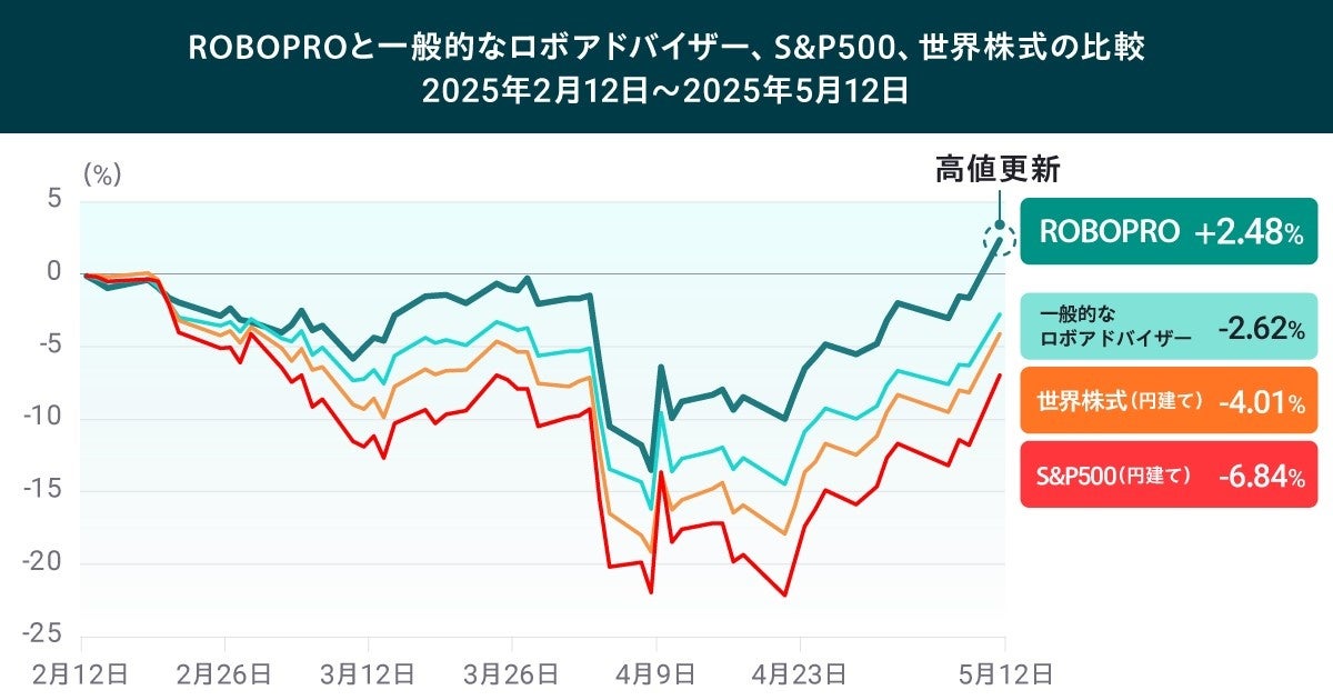 相互関税の追加部分の一時停止が発表された後に、株式市場は回復基調となりましたが、「ROBOPRO」は株式市場の下落に合わせて株式資産の組み入れを引き上げていたため、回復局面でも上昇に追従することができ、米中が関税の引き下げに合意した5月12日には、2月12日を基準としてS&P500が-6.84%、世界株式が-4.01%、一般的なロボアドバイザーが-2.62%に留まるなか、最高値を更新することができました。