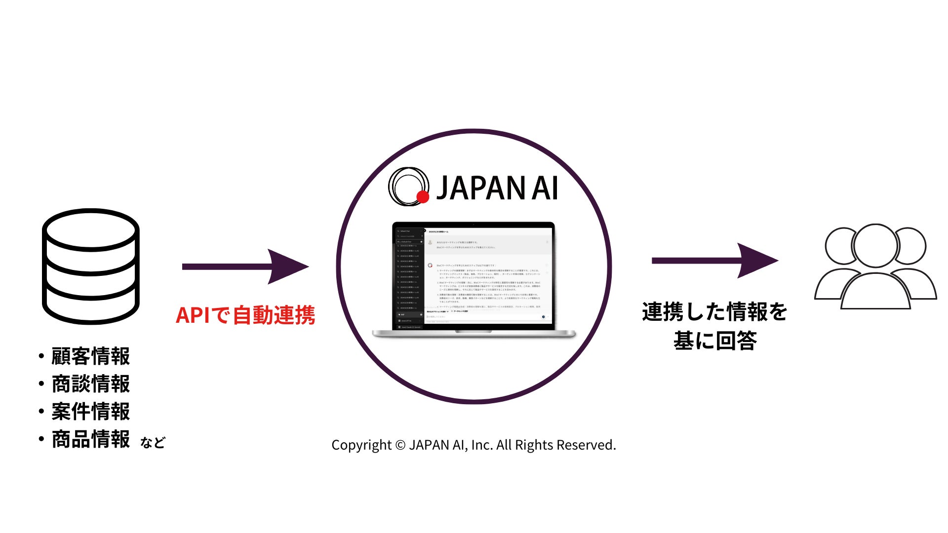 「JAPAN AI CHAT(™)」、「JAPAN AI MARKETING(™)」はこのアクセス権設定に対応しており、使用者が権限を持つ情報のみをAIと連携させることができます。