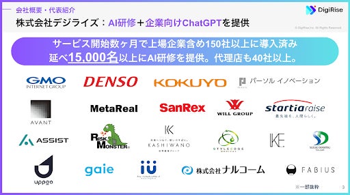 株式会社デジライズは「AIの利便性と感動を全ての人へ」をビジョンとして2023年に事業を開始しました。「法人リスキリング®︎」というAI研修(動画学習+ワークショップ)と自社開発の企業向けChatGPT「AI Works」を提供するサービスを、上場企業を筆頭に多くの企業様に導入を進めております。