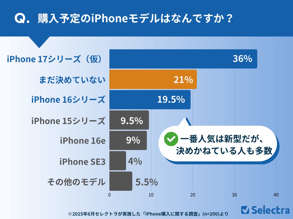セレクトラ・ジャパン株式会社(本社:東京都渋谷区、代表取締役:グザビエ・ピノン)は、これから半年以内にiPhoneの購入を検討している男女200名を対象に、2025年9月に発売が噂されるiPhone 17の発売を待ってから購入するかどうか、アンケート調査を実施しました。