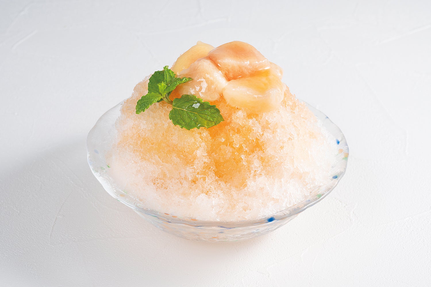 ごろっとした桃を添えたかき氷に、特製のももシロップをたっぷりとかけてお楽しみください。