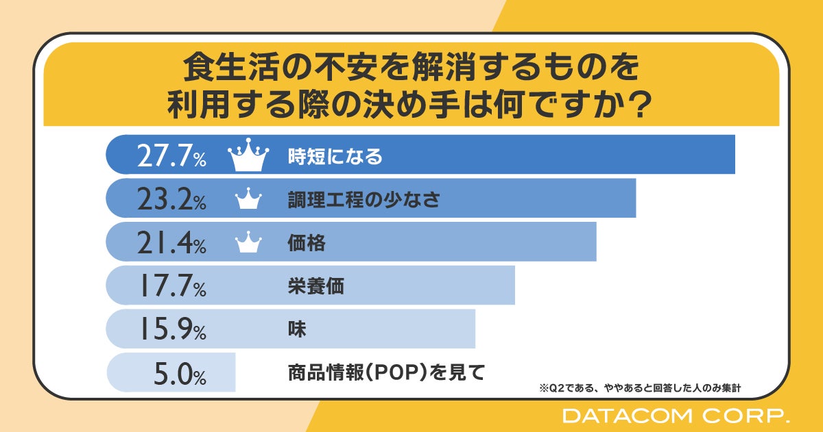 食生活の不安を解消する食品を利用する決め手としては、「時短になる」27.7%が最も多く、次点が「調理工程の少なさ」23.2%となり、手間や時間を削減できることが重視される結果に。「レトルト食品」や「出来合いの惣菜」を求める人が多かったことからも明確なニーズがあると言えそうです。