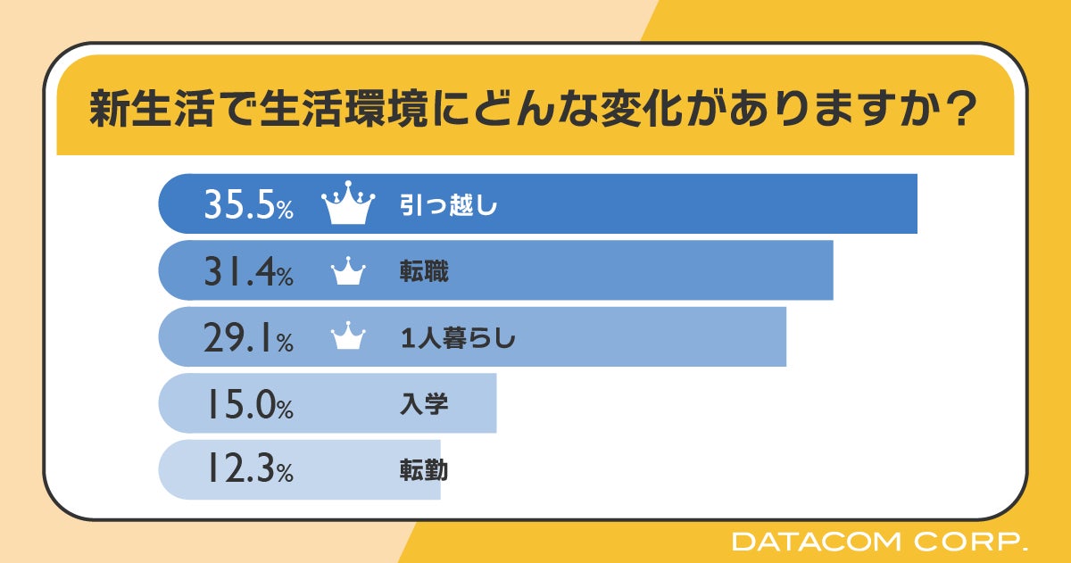 新生活の環境の変化について尋ねたところ、1位が「引っ越し」35.5%、2位は「転職」31.4%、3位の「1人暮らし」が29.1%と続きました。