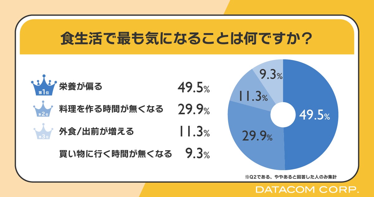 食生活の変化で最も気になることについては、「栄養が偏る」49.5%が1位に。次いで2位「料理をする時間が無くなる」29.9%、3位「外食/出前が増える」11.3%という回答になりました。