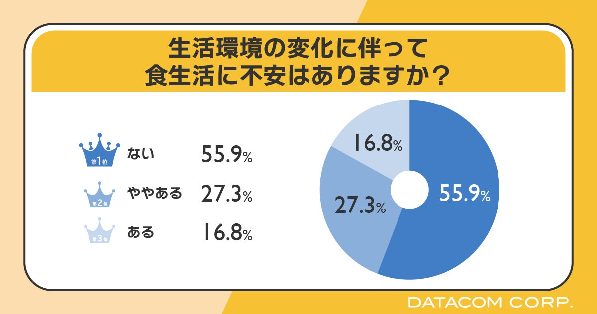 環境が変わることによる食生活の変化に不安があるかという質問について、「ない」55.9%、「ややある」27.3%、「ある」16.8%という結果に。