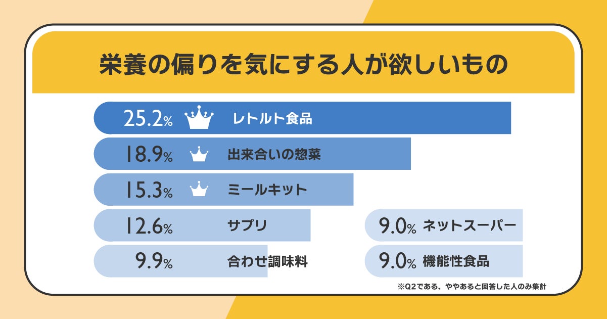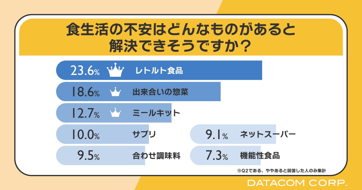 食生活の不安を解消するために欲しいものを尋ねたところ、「レトルト食品」23.6%や「出来合いの惣菜」18.6%、「ミールキット」12.7%が上位に。