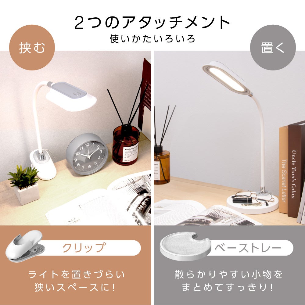 クリップ(厚み最大約4cm対応)とベーストレー(小物整理にも便利)の2つのアタッチメントを付け替えて、明かりが必要な場所に自由に設置できます。