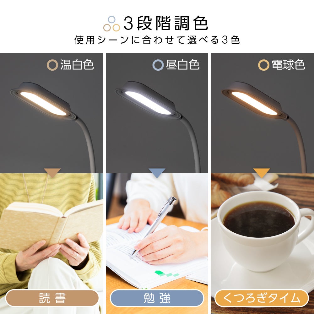3段階調色・5段階調光でシーンに合わせて好みの明かりに設定でき、時計とアラーム機能で作業時間もしっかり管理できます。