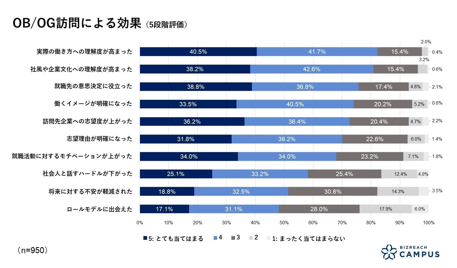 今回のアンケート結果から特筆すべきことは、OB/OG訪問の効果として、特に社風や企業文化、実際の働き方への理解度が高まったという項目が高くなっているのは、大量に流される情報の中でよりリアルな接点が貴重であることが裏付けられたという点です。これは企業にとっても人材確保のみならず入社後の定着にとっても大きなメリットであると考えられます。