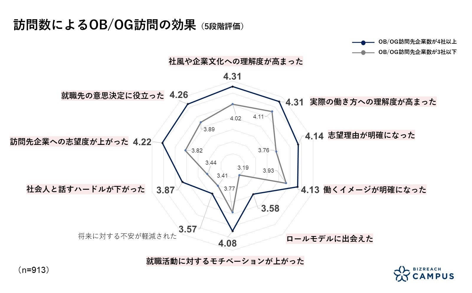 また、OB/OG訪問を実施した学生と実施しなかった学生を比較したところ、実施した学生のほうが内定獲得数が多く、特にOB/OG訪問先企業数が4社以上の学生のほうが、3社以下の学生に比べて内定獲得数がより多いことが分かりました。訪問先企業数が4社以上の学生は、「社風や企業文化への理解度が高まった」「実際の働き方への理解度が高まった」「ロールモデルに出会えた」「就職活動に対するモチベーションが上がった」など、訪問先企業に対する理解度や働くイメージの明確化、ロールモデルの発見、就職活動に対するモチベーションの向上などの指数※2で有意差が顕著となりました。