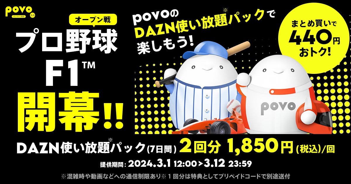 KDDI、沖縄セルラーは2024年3月1日から3月12日まで、povo2.0において、2回分の「DAZN使い放題(7日間)」を440円おトクにまとめ買いできる期間限定トッピングを提供します。通常1,145円/回のところ、実質925円/回でお楽しみいただけます。